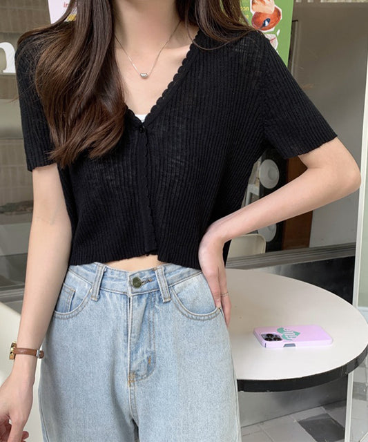 シアー Vネック 半袖 リブ ニット ショート カーディガン