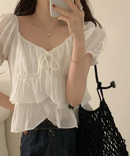 ボウタイ リボン パフスリーブ ショート ブラウス