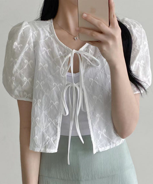 刺繍 リボン付き パフスリーブ ショート ブラウス