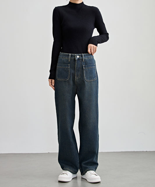 パッチポケット付き ハイウエスト ストレート ワイド デニム 裏起毛
