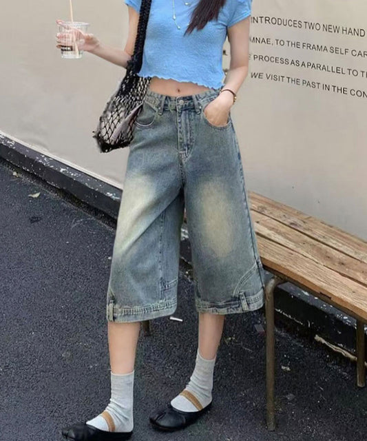 ウォッシュ加工 ユニーク ハイウエスト6分丈 デニムパンツ