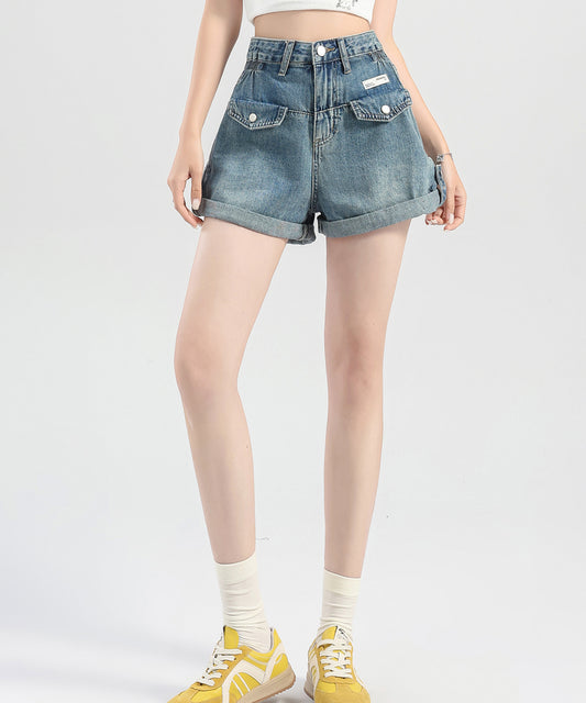 ハイウエスト ポケット付き ロールアップ デニム Aライン ショートパンツ