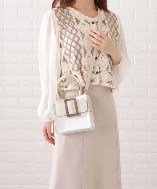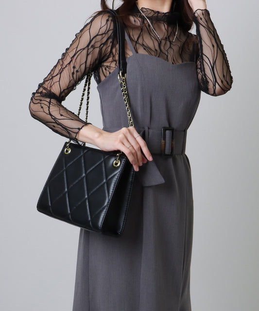 リボン付き Vステッチ スクエア チェーン ショルダーバッグ