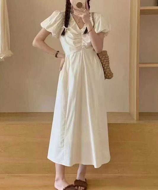 フロント シャーリング Vネック パフスリーブ ロング ワンピース