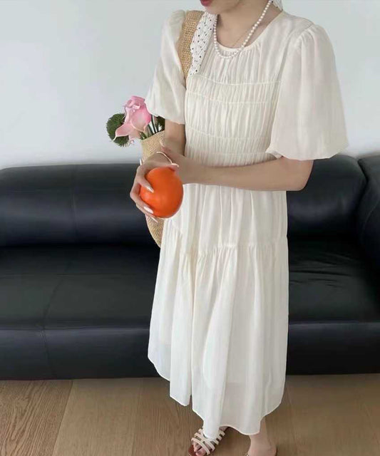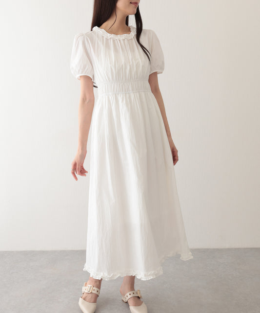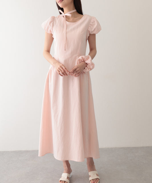 チョーカー付き クルーネック パフスリーブ ギャザー ロング ワンピース