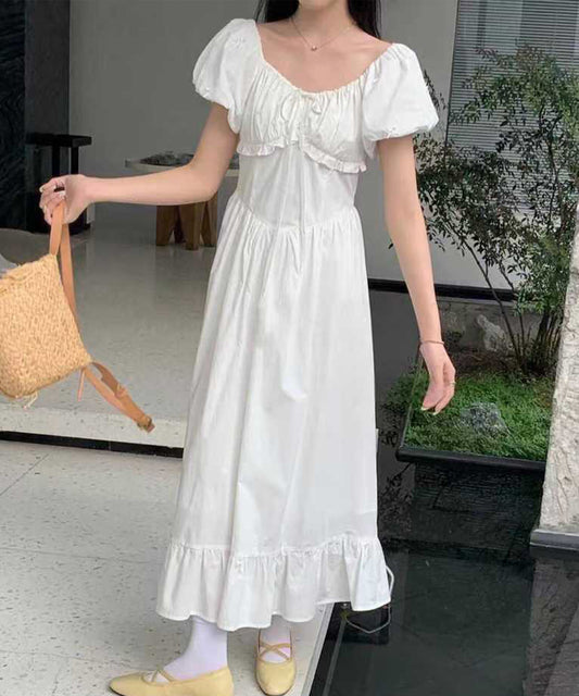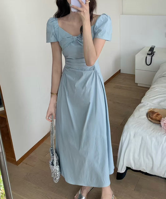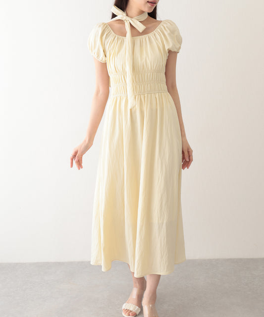 タイ付き パフスリーブ ギャザー ロング ワンピース