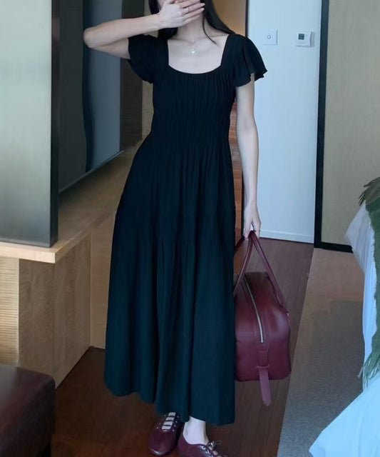 スクエアネック フレア袖 シャーリング ティアード ロング ワンピース