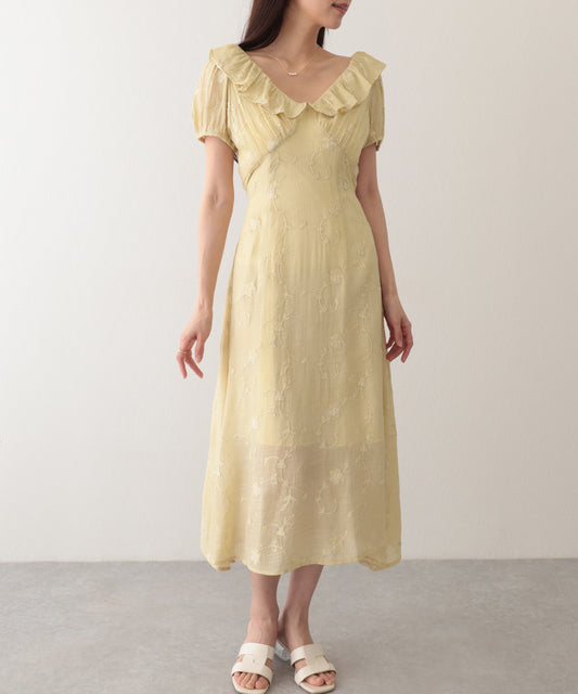 ボタニカル柄 フリル カラー ロング ドレス ワンピース