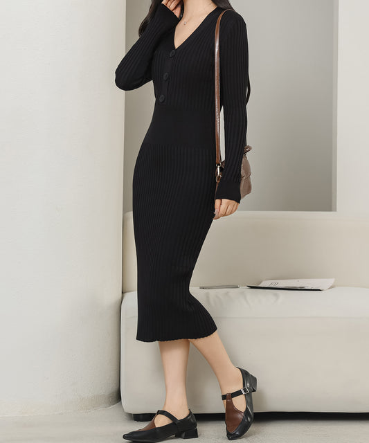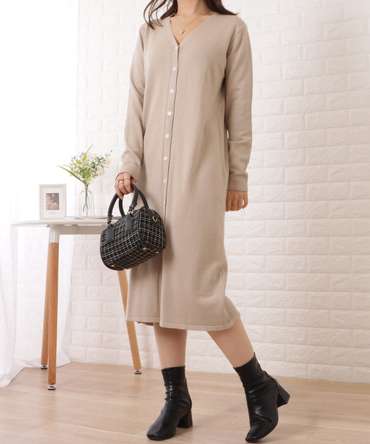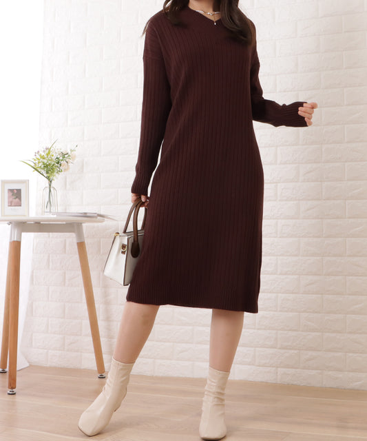Vネックリブニットミディワンピース