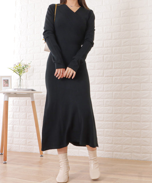売り切れVネックスリムニットロングワンピース