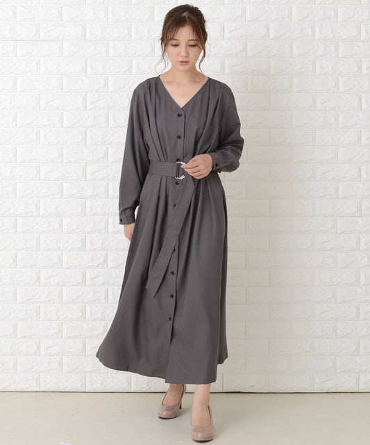 Vネックベルト付き長袖ワンピースドレス