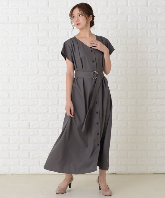 Vネックベルト付き半袖ワンピースドレス