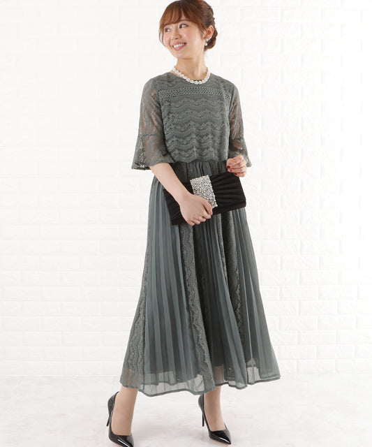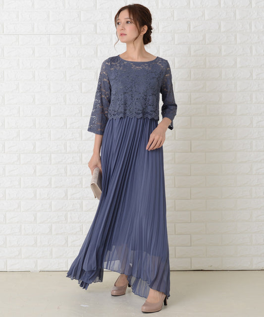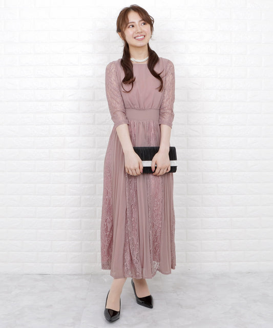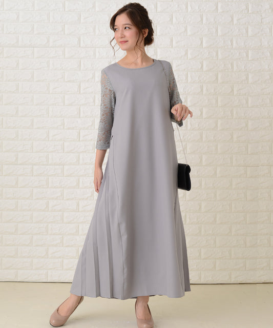 レース七分袖ロング丈バックプリーツワンピース・ドレス