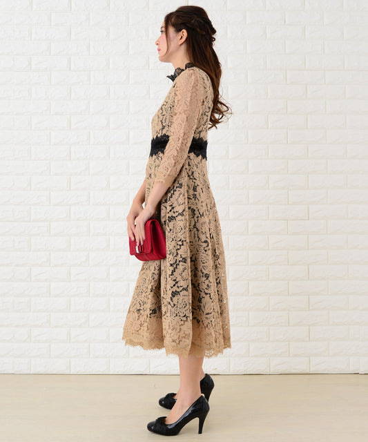 花柄総レースミモレ丈フレアワンピース・ドレス