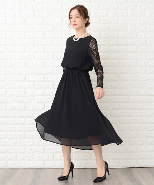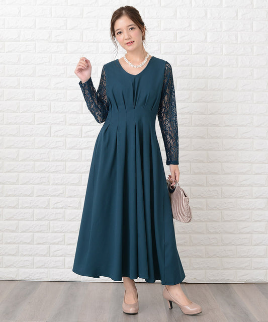 袖レース切替Aラインフレアロングワンピース・ドレス