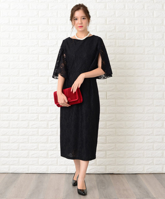 花柄レース袖バックスリット入りタイトワンピース・ドレス