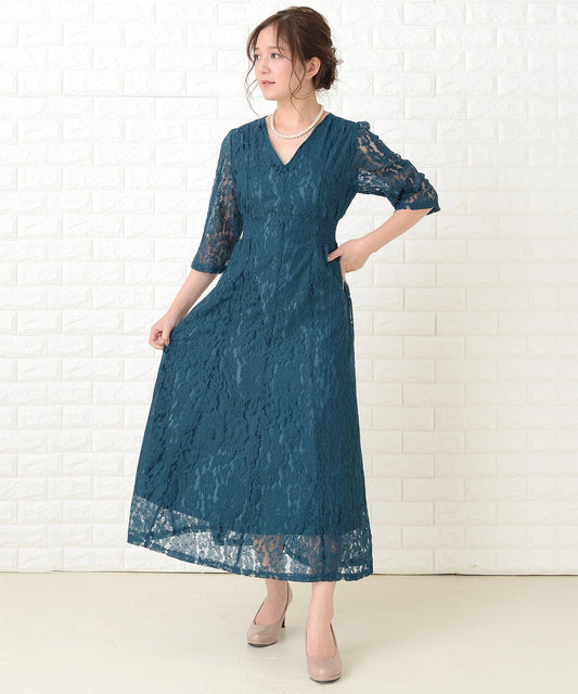 襟元スッキリ 総レース七分袖ロング丈ワンピース・ドレス