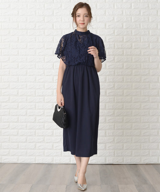 花柄レースIラインハイネックケープ風パーティードレス・ワンピース