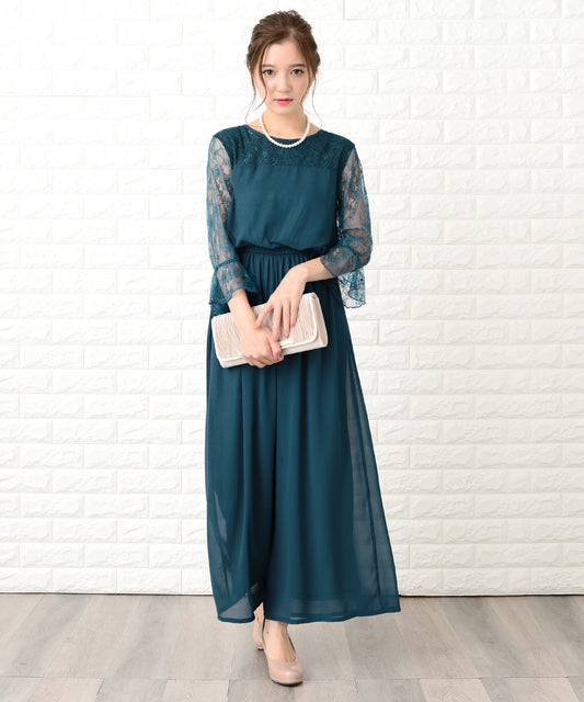 袖レースウエストゴムシフォンフォーマルロングパンツドレス