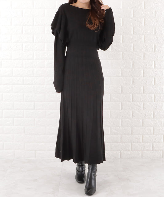 シースルーフリル長袖膝丈ドレス・ワンピース
