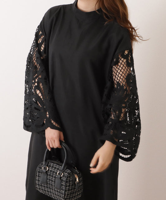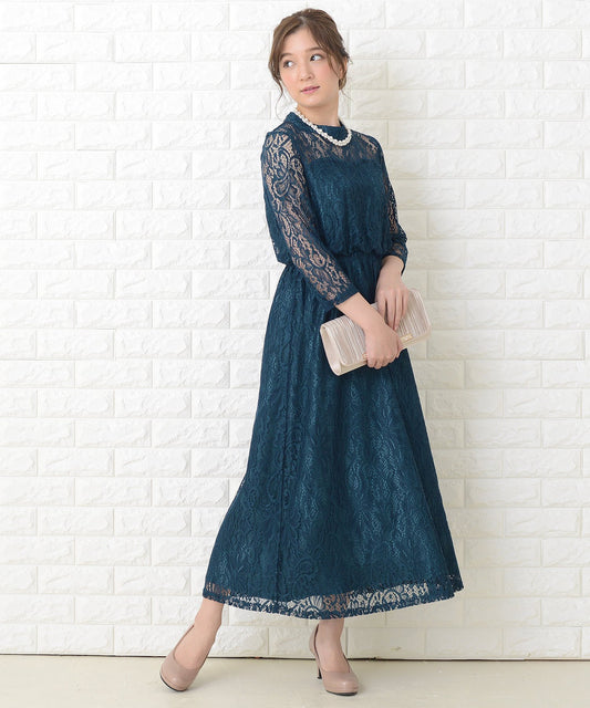スタンドカラー レース スリーブ ロング ワンピース