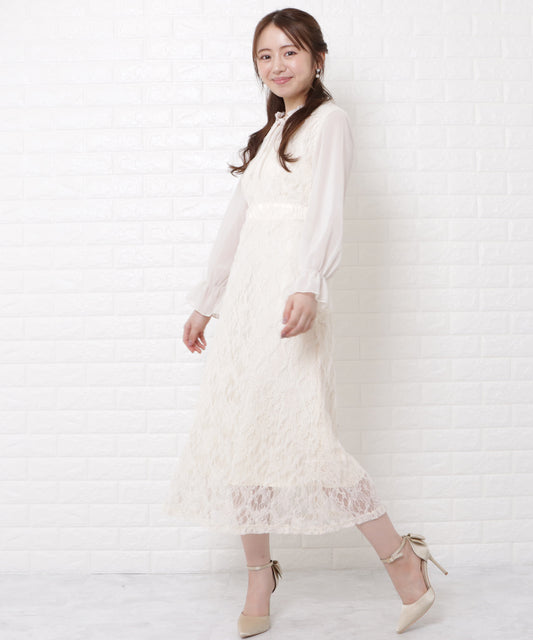 スタンドカラーレースドッキングシフォンワンピース