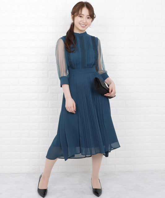 シースルー袖シフォンプリーツワンピースドレス