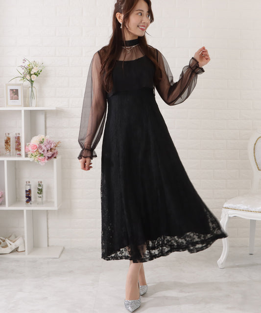 シースルー袖総レースロング丈ワンピース・ドレス