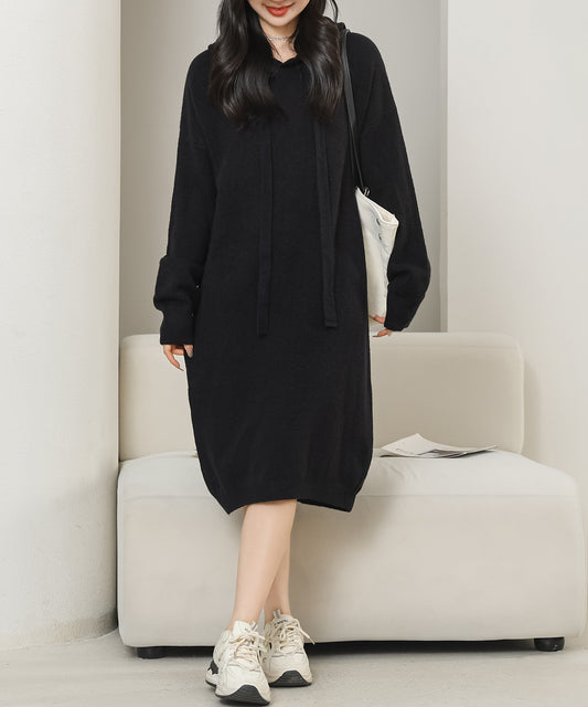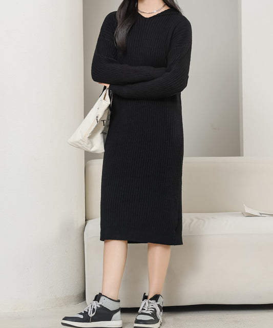 ソリッドカラー フーデット 長袖 ニット ワンピース