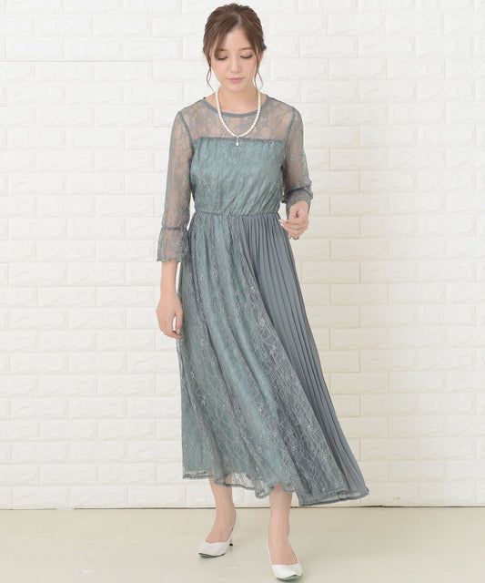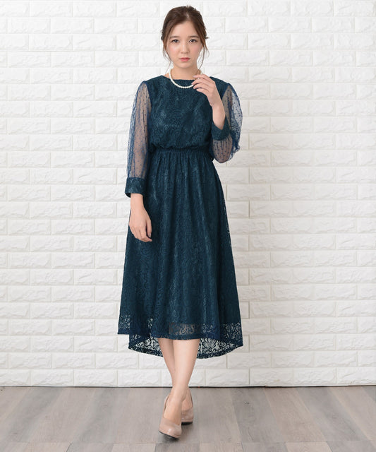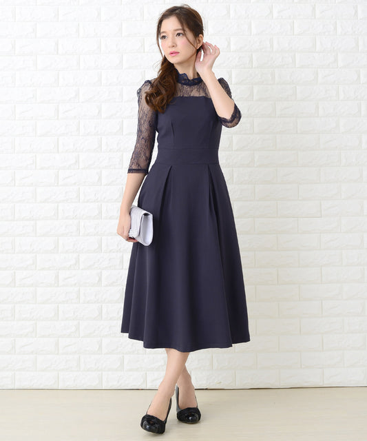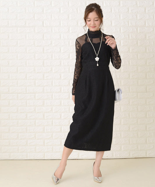 デコルテシースルー×レース袖クラシカルワンピースドレス
