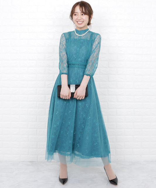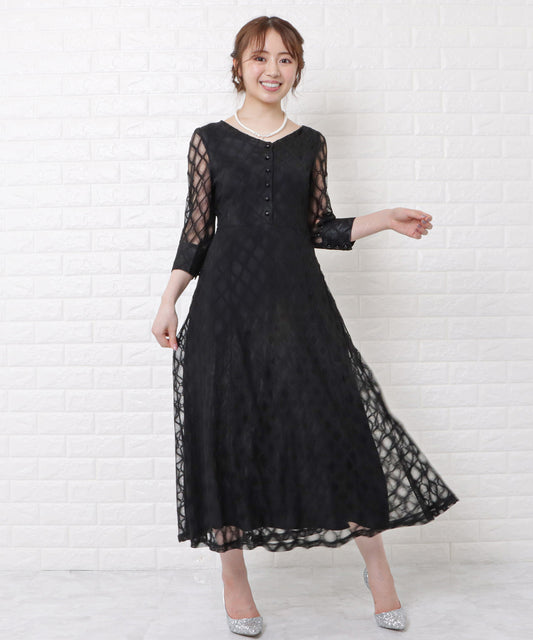 デコルテシースルー レース七分袖 クラシカルロング丈ワンピースドレス
