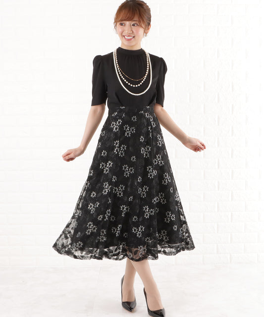 ドットチュール袖×花柄総レースフィッシュテールフォーマルワンピース・ドレス
