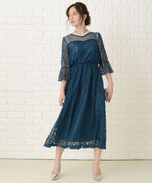 デコルテチュール×総レースフレア袖ロングワンピース・ドレス