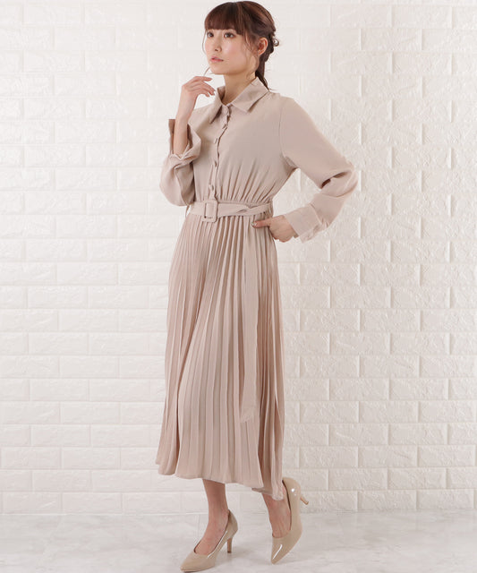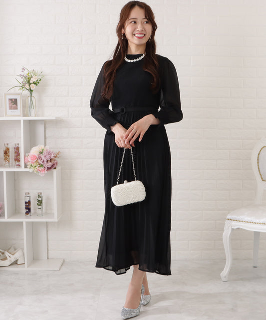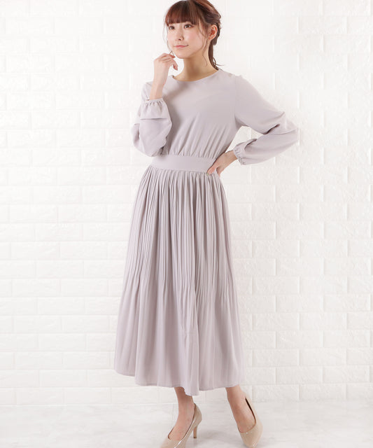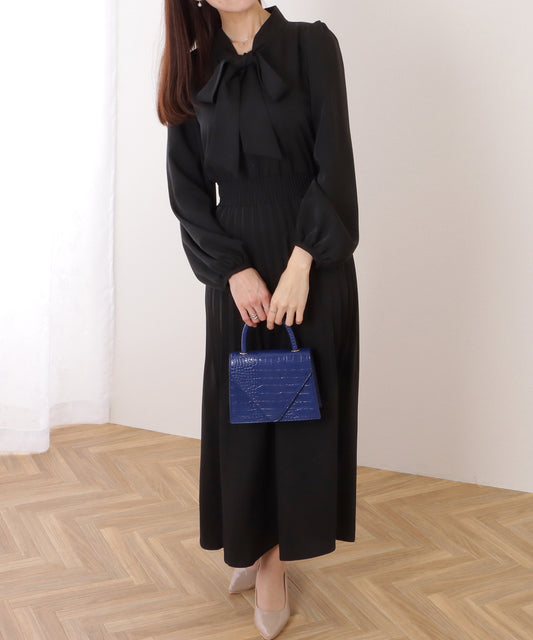 ボウタイ付き パフスリーブ プリーツ ロング ワンピース