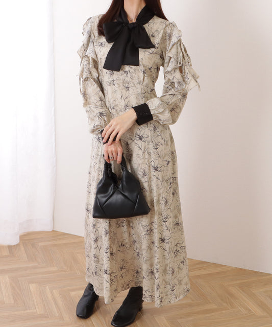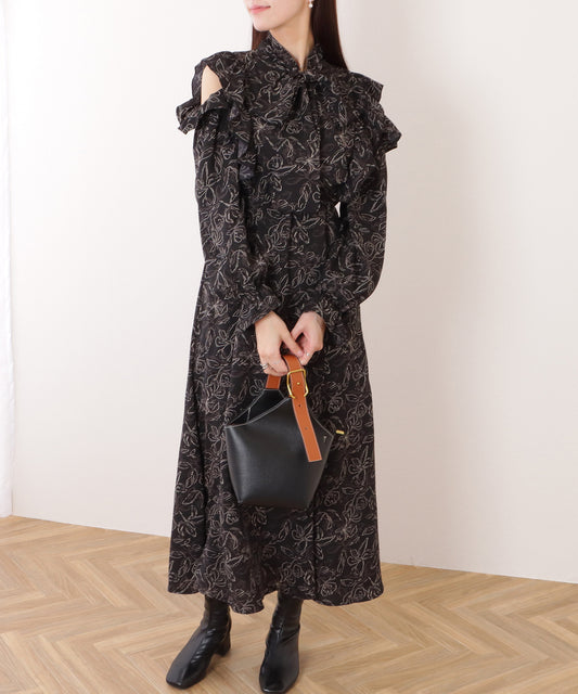 ボウタイ付き 花柄 カットアウト フリル ワンピース