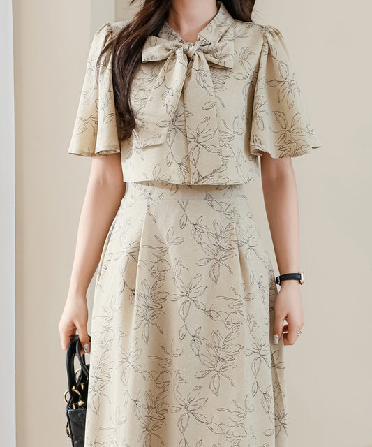 ボタニカル柄 ボウタイ付き ケープ風 ロング ワンピース