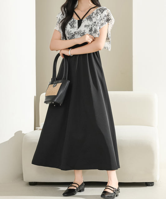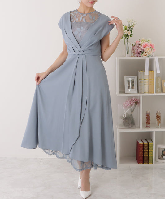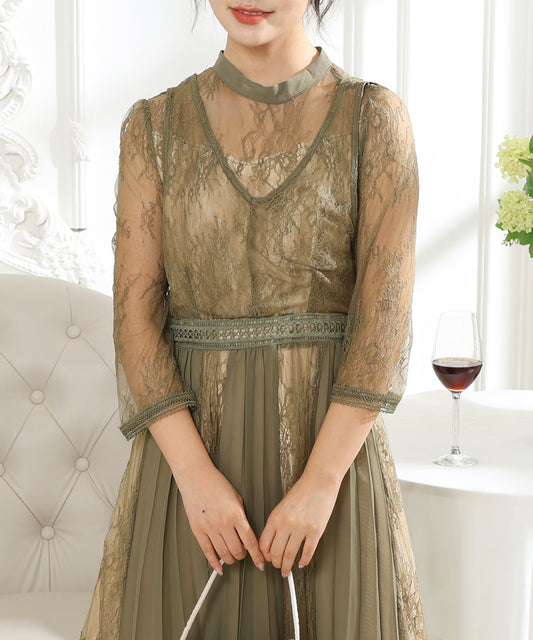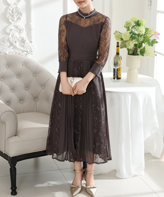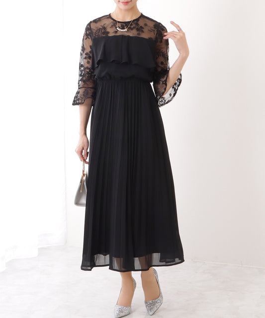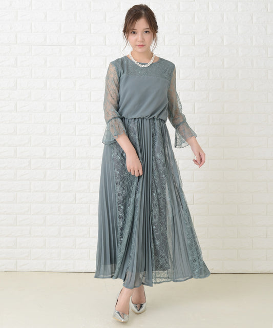 プリーツ&花柄レースロング丈 ワンピース・ドレス