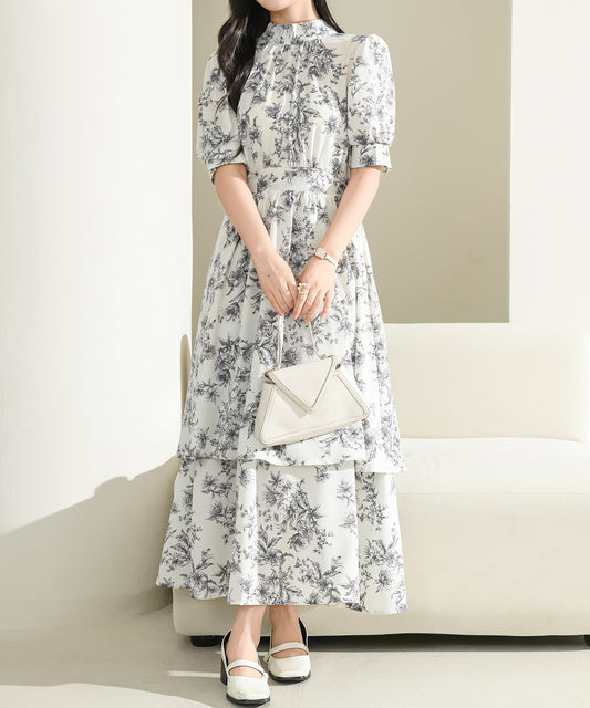 ボタニカル柄 ティアード フリル プチハイネック ロング ワンピース