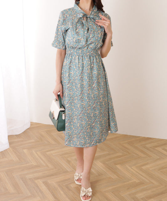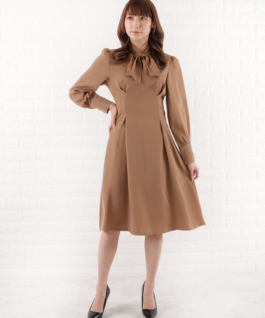 ボウタイ付き ウエスト シャーリング パフスリーブ ミディ丈 ワンピース