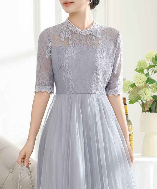 プチハイネック レース ドッキング 半袖 チュール ワンピース