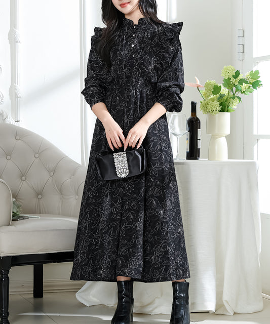 フラワー プリント フリル スタンドカラー ワンピース