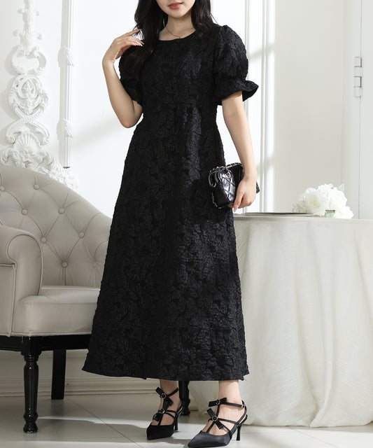 フラワー ジャガード パフスリーブ フレア ワンピース