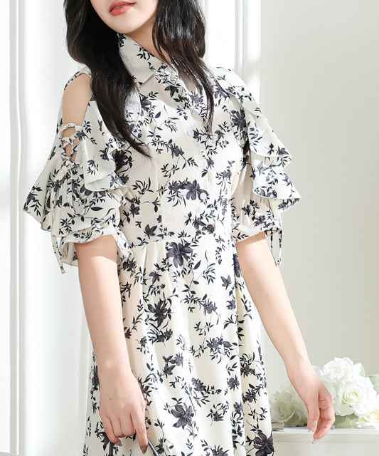フリル袖 ドッキング カットアウト シャツ ワンピース
