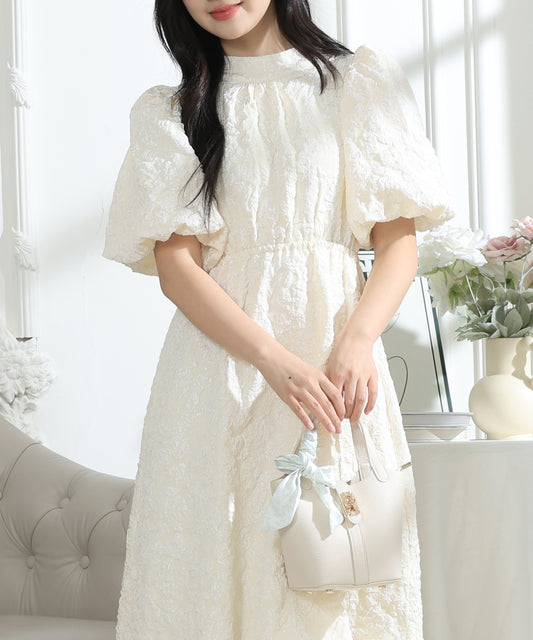 フラワー ジャガード バックリボン パフスリーブ ワンピース