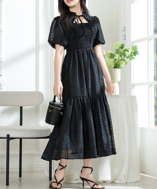バックレースアップ パフスリーブ ティアード ロング ワンピース