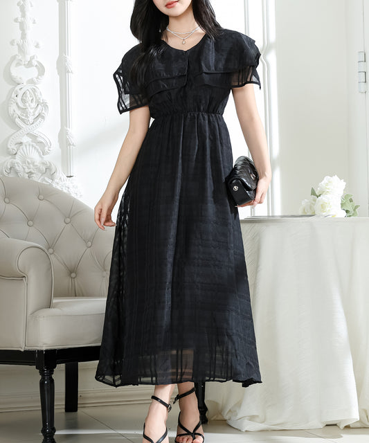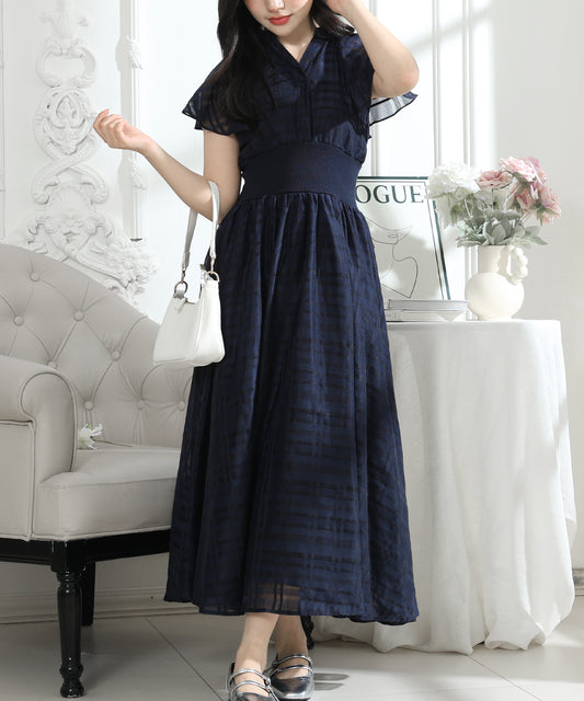 シアー チェック柄 スクエアカラー ロング ワンピース