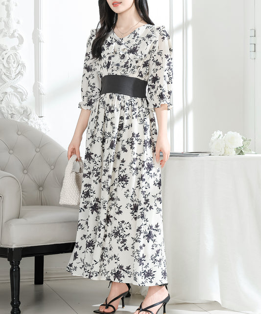 ボタニカル柄 袖カットアウト プリーツ ロング ワンピース
