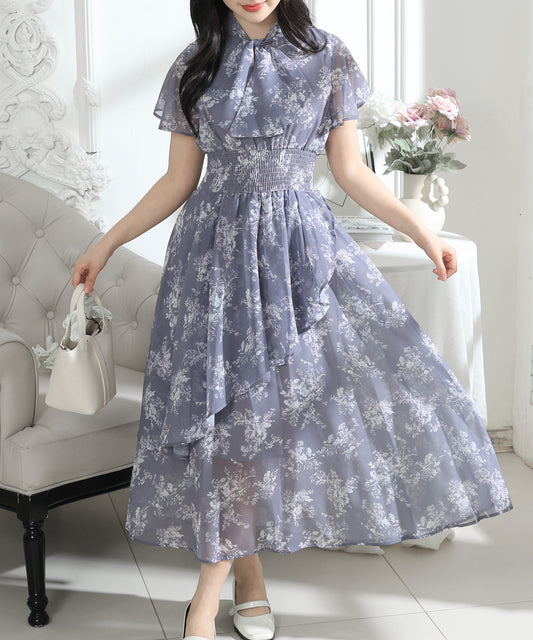 花柄 ボウタイリボン フレア袖 ティアード ワンピース