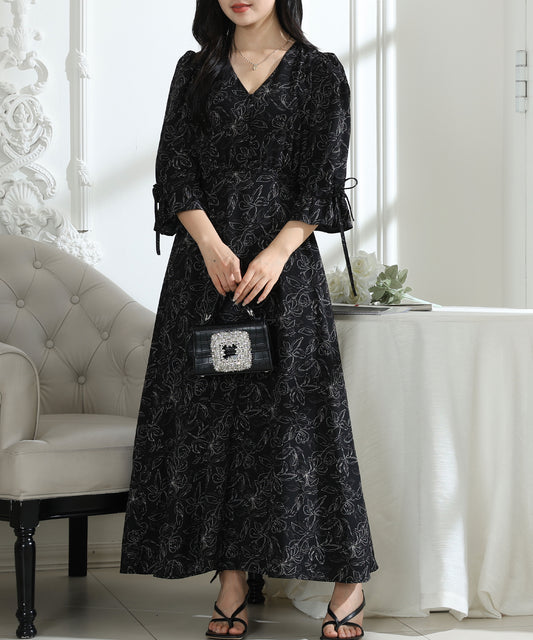 ボタニカル柄 Vネック キャンディスリーブ 6分袖 ワンピース