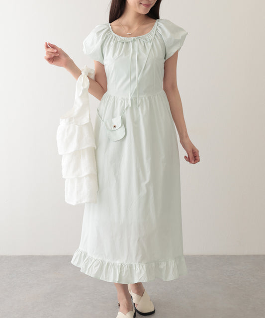 ポシェット付き ラウンドネック ギャザー ロング ワンピース